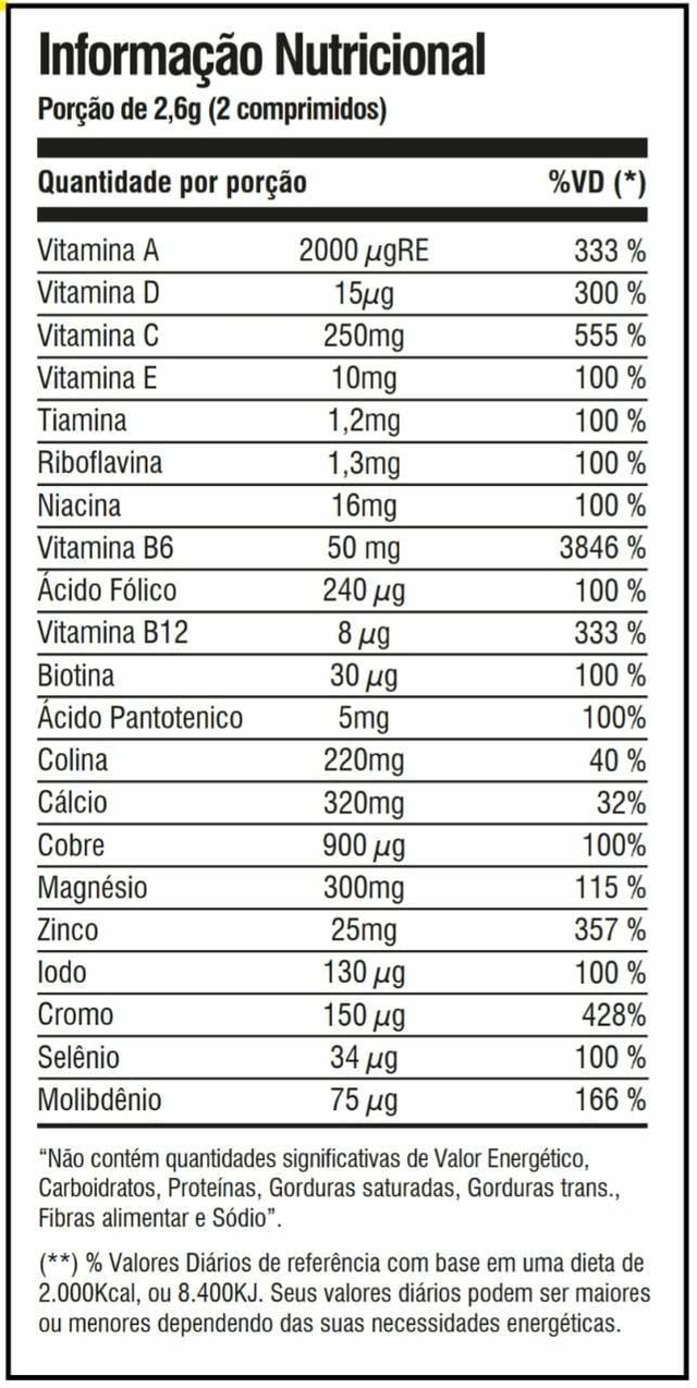 Óxido de magnésio, Ácido Ascórbico, Colina, Bisglicinato de Zinco, Piridoxina Hcl, Vitamina E, Nicotinamida, Vitamina D3, Pantotenato de Cálcio, Vitamina A acetato em pó, Sulfato de Cobre anidro, Riboflavina, Picolinato de Cromo, Moninitrato de Tiamina, Ácido Fólico, Selenito de Sódio, Biotina, Molibdato de Sódio diihidratado, Iodo, Cianocobalamina; Antiaglutinante: Carbonato de Cálcio; Estabilizantes: Celulose Microcistalina, Coscamelose Sódica; Antiumectante: Dióxido de Silício; Espessantes: Estearato de Magnésio, Copolimero Enxertado de Álcool PolivinÍlico e Polietilenoglicol; Corante: Dióxido de Titânio INS 171.